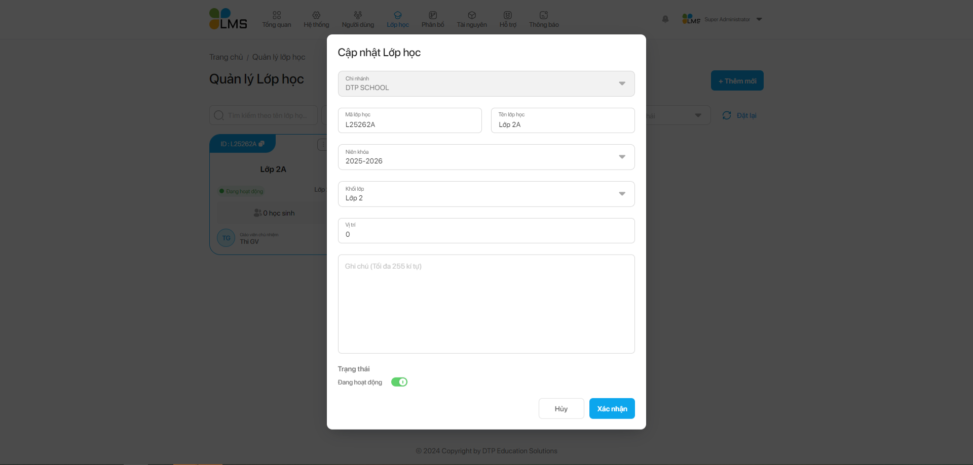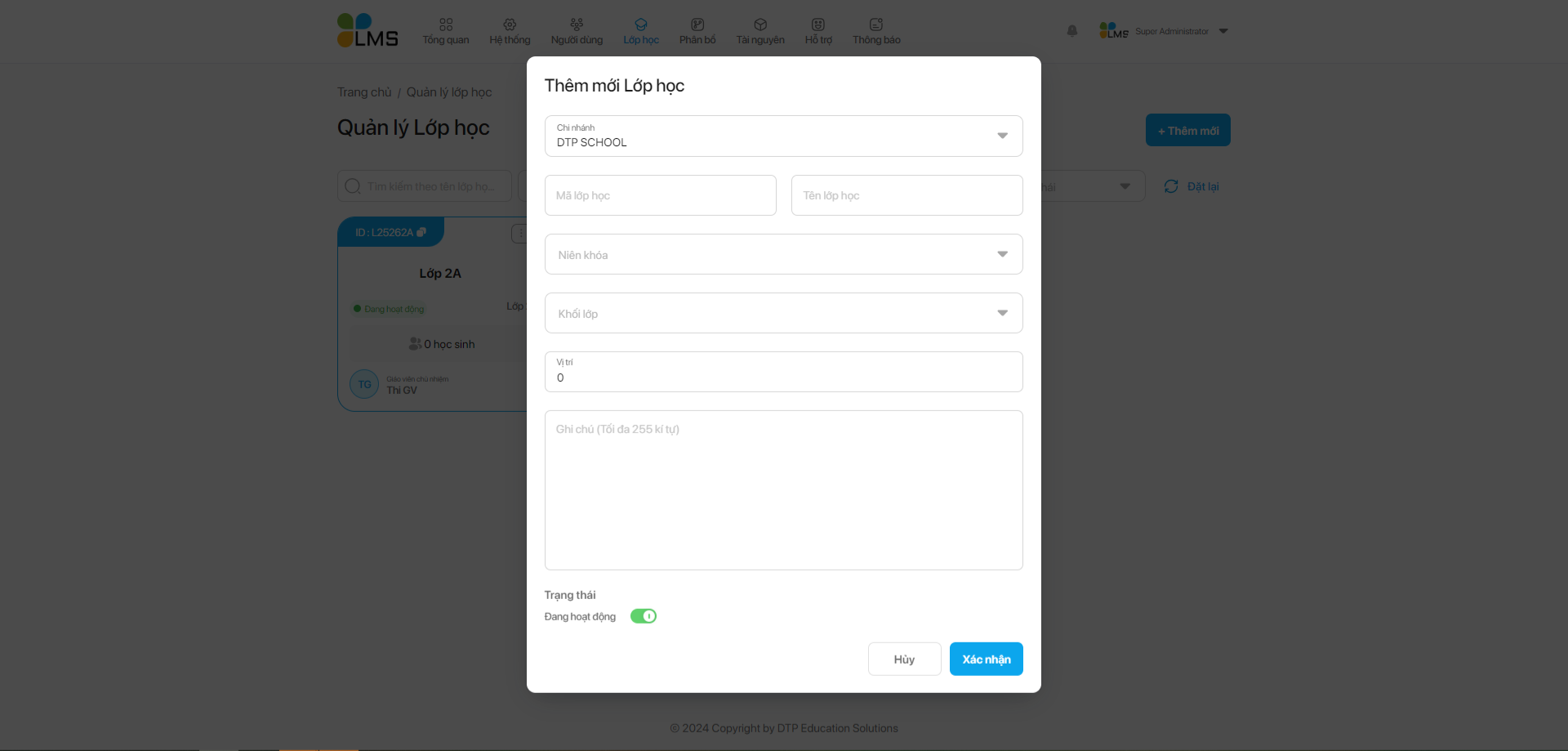 **Bước 2:** Nhập thông tin lớp học và nhấn nút Xác nhận để thêm mới lớp học