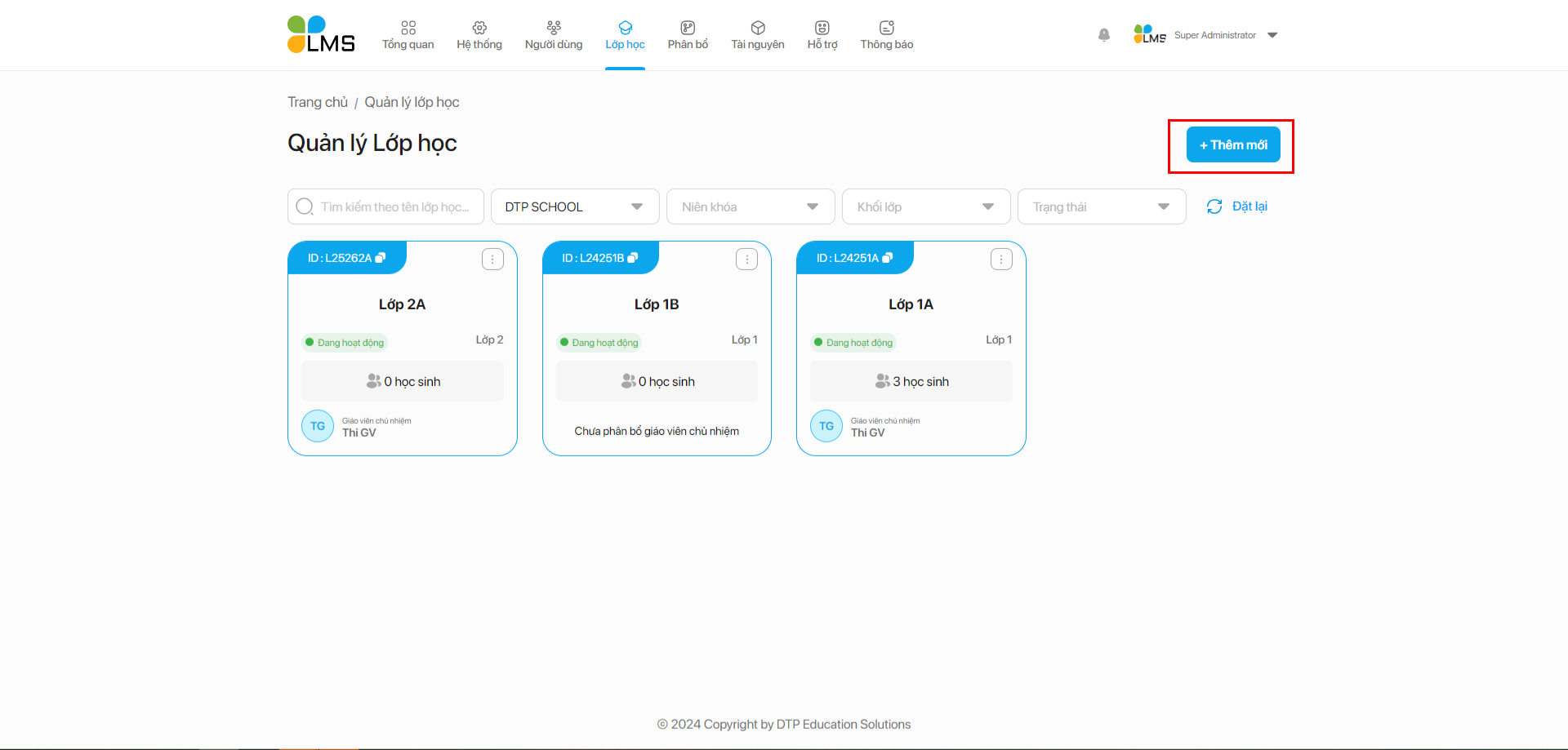 **Bước 1:** Tại giao diện quản lý lớp học nhấn nút "Thêm mới"