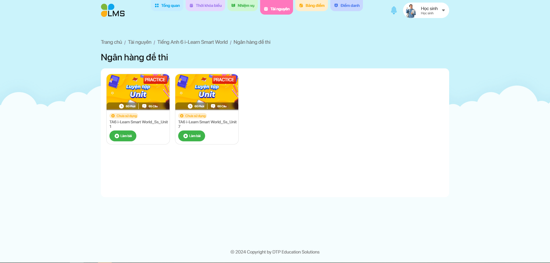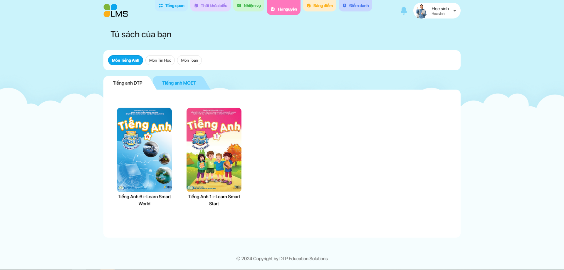 **Bước 1:** Chọn Menu "Tài nguyên", khi đó hệ thống hiển thị danh sách tài nguyên được trường cấp quyền sử dụng sắp xếp theo từng môn học
