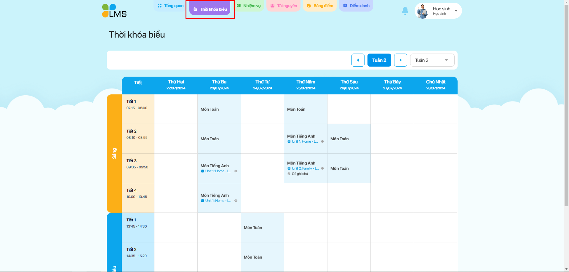 **Bước 1:** Chọn Menu "Thời khóa biểu", hệ thống sẽ hiển thị Thời khóa biểu của lớp học